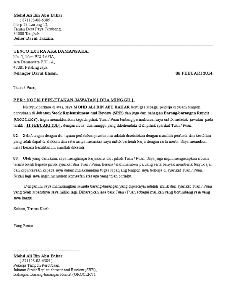 Surat Perletakan Jawatan Kerana Masalah Peribadi Letter 7saudara Com
